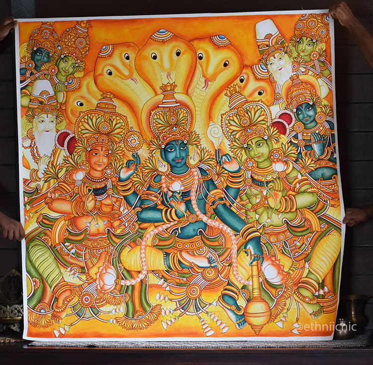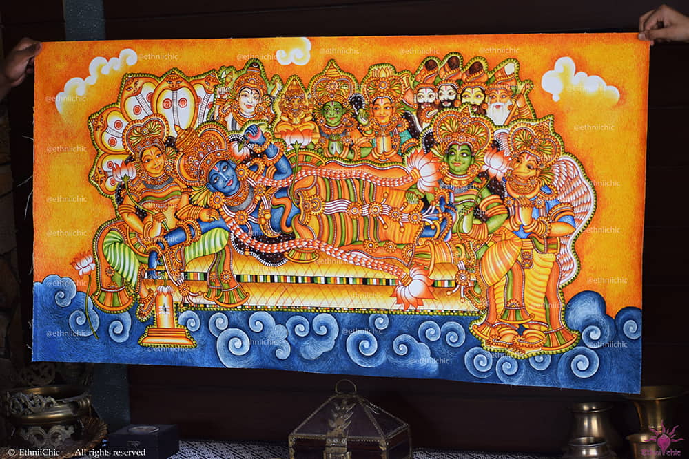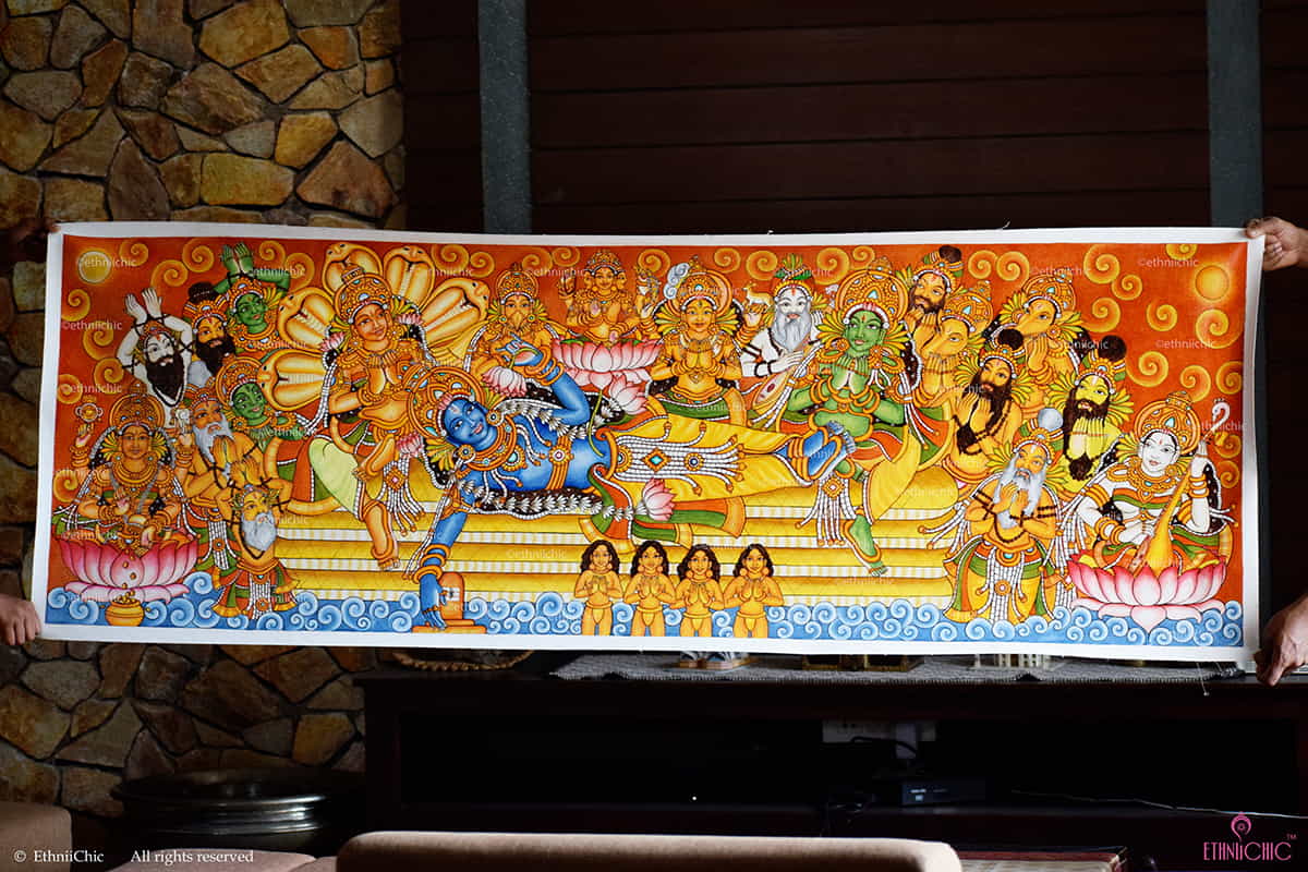 A commissioned Kerala Mural Painting on Canvas of size 6 feet x 2 feet of Ananthashayanam, was done for a customer in UK.