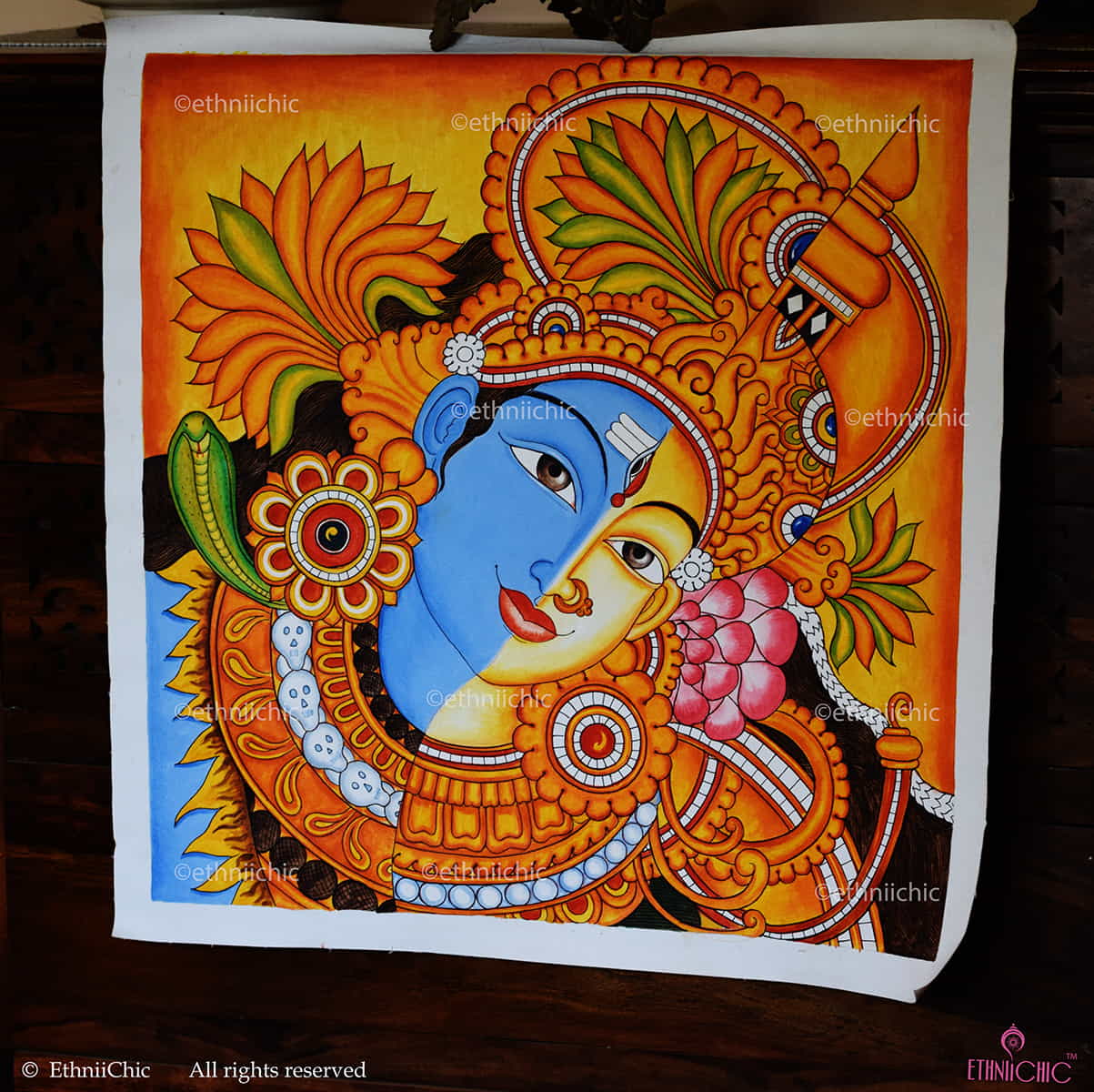 A commissioned Kerala Mural Painting on Canvas of size 4 feet x 2 feet of Ardhanarishwaran, , was done for a customer in Bangalore.