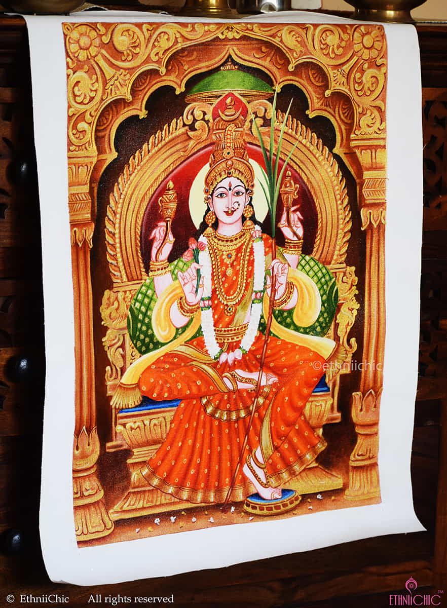 A commissioned Kerala Mural Painting on Canvas of size 5 feet x 2.5 feet each of Parvathy Chamayam, the depiction of goddess Parvathi being dressed up by her companions for her wedding, was done for a customer in Coimbatore.