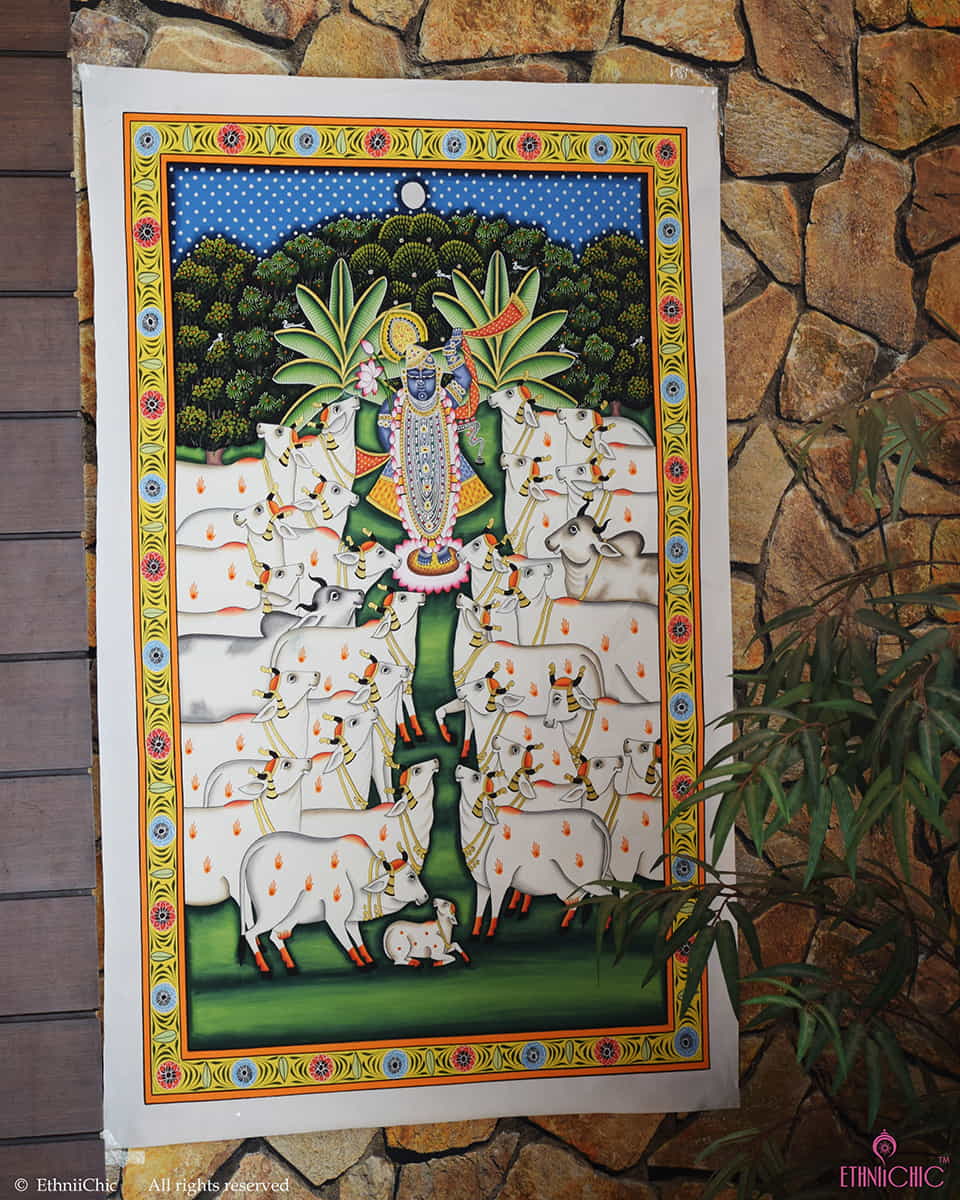 A commissioned Pichwai Painting on Canvas cloth of size 2 feet x 3 feet of Gopashtami, was done for a customer in Chennai.