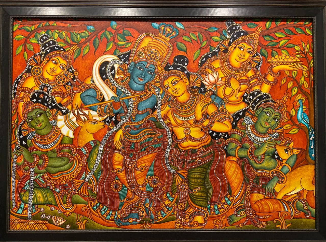 A commissioned Kerala Mural Painting on Canvas of size 3.5 ft x 2 ft of Krishna with Gopikas, was done for a customers in USA