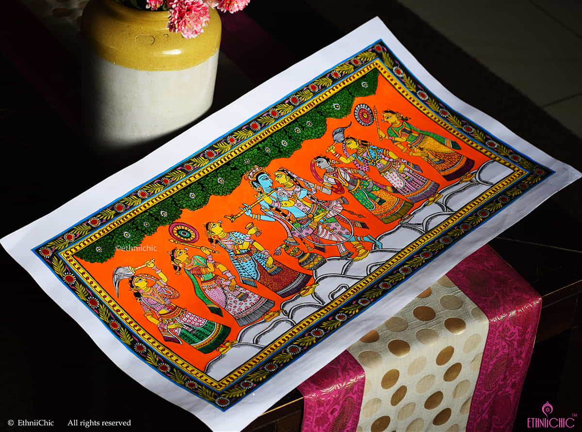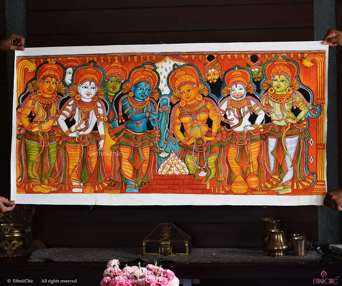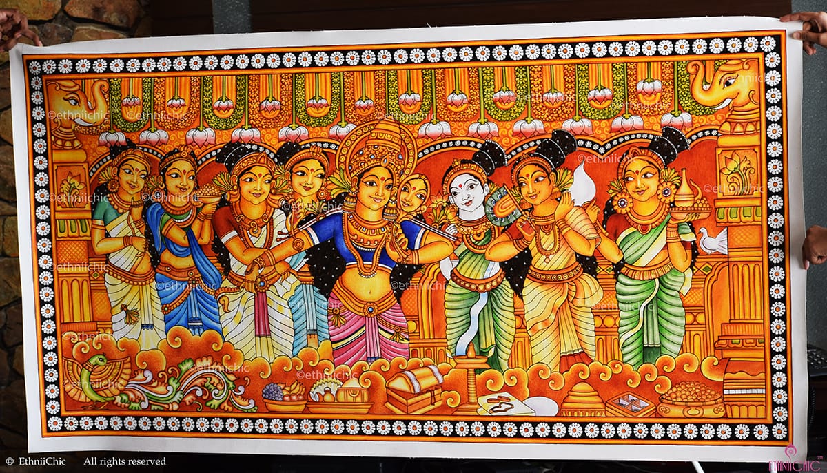 A commissioned Kerala Mural Painting on Canvas of size 4 feet x 1.75 feet of Sita Rama Kalyanum, was done for a customer in UK.