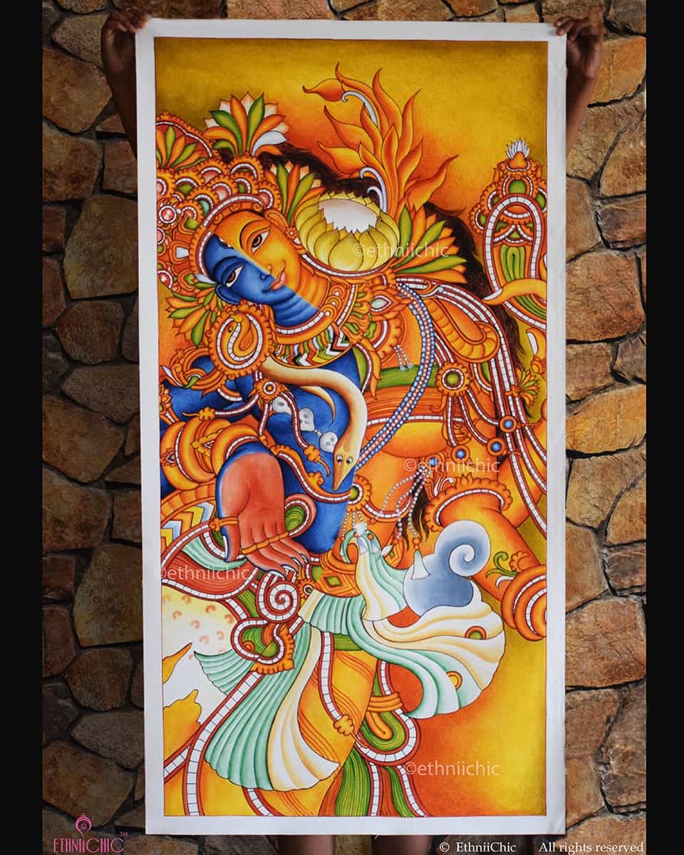 A commissioned Kerala Mural Painting on Canvas of size 4 feet x 4 feet with the theme of Vishniu was done for a customer in Bangalore for their new abode.