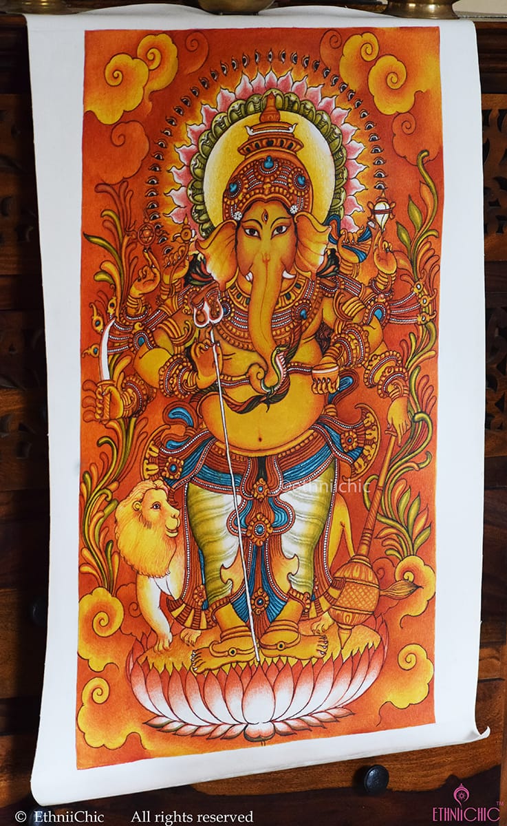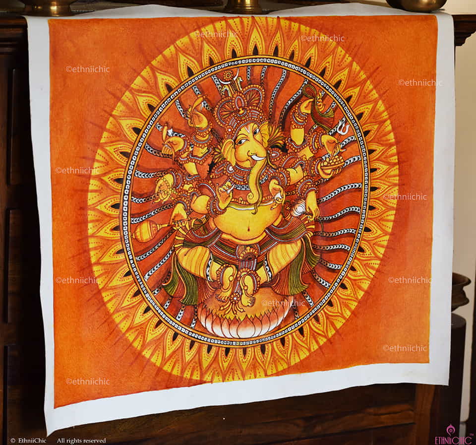 A commissioned Kerala Mural Painting on Canvas of size 1.5 feet x 2.5 feet each of Drushti Ganapathi, was done for a customer in Coimbatore.