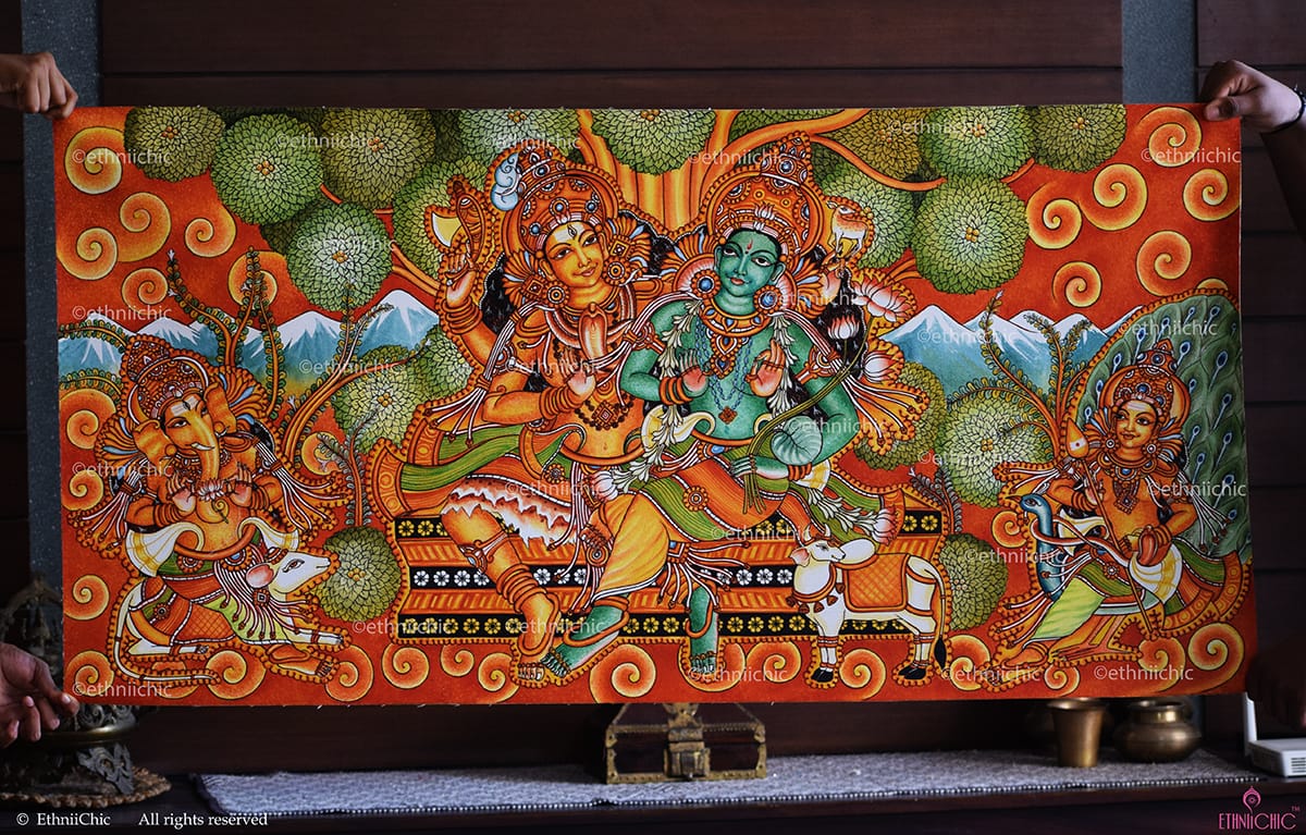 A commissioned Kerala Mural Painting on Canvas of size 4 feet x 2 feet of Shiva Kudumbam, was done for a customer in United Kingdom.