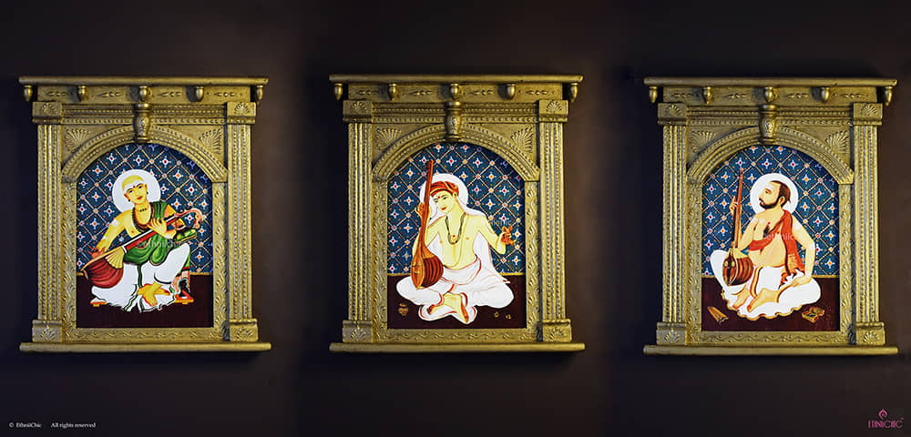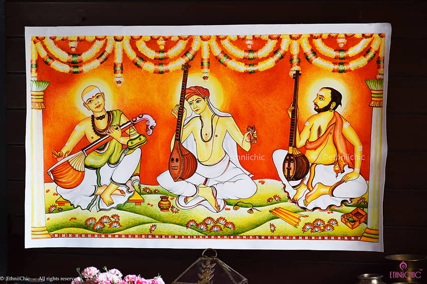 A commissioned Kerala Mural Painting on Canvas of size 3.5 feet x 2 feet with the theme of Sangeetha Thirumoorthigal, honouring the trinity of Carnatic Classical Music, was done for a customer in USA.