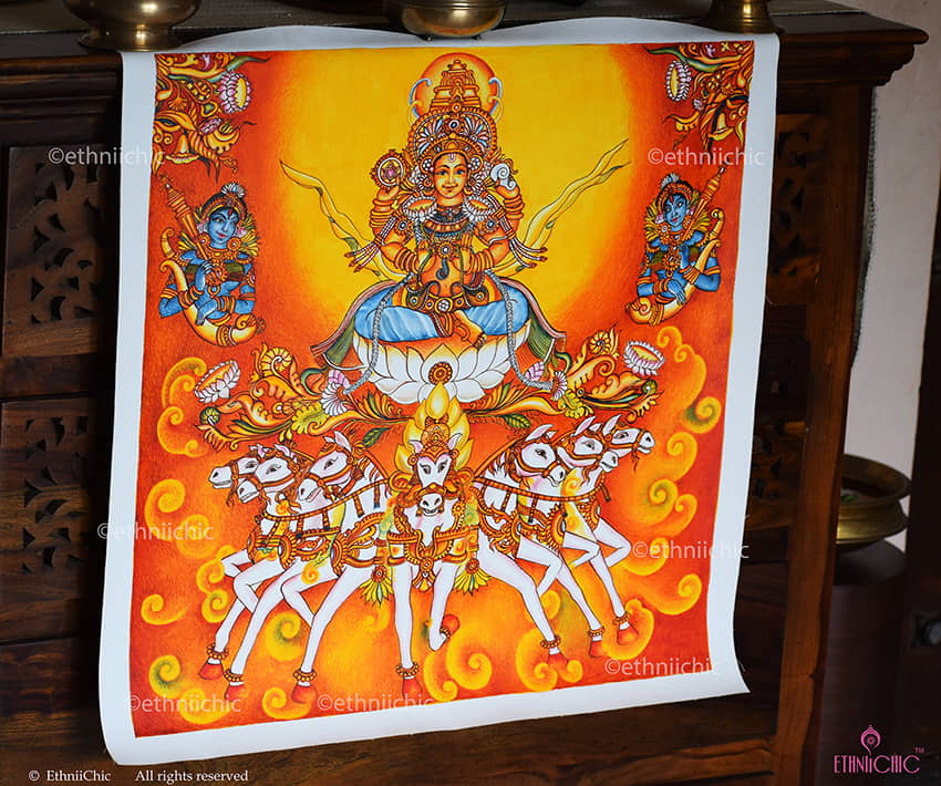 A commissioned Kerala Mural Painting on Canvas of size 2 feet x 2 feet each of Surya Bhagwan with his 7 horses, was done for a customer in USA.