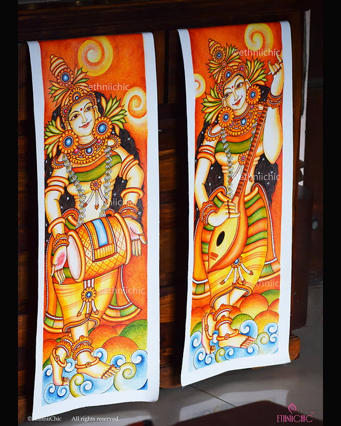 A commissioned Kerala Mural Painting on Canvas of size 3 feet x 1 feet each of Apsaras holding Indian Classical Music Instruments, was done for a customer in USA.