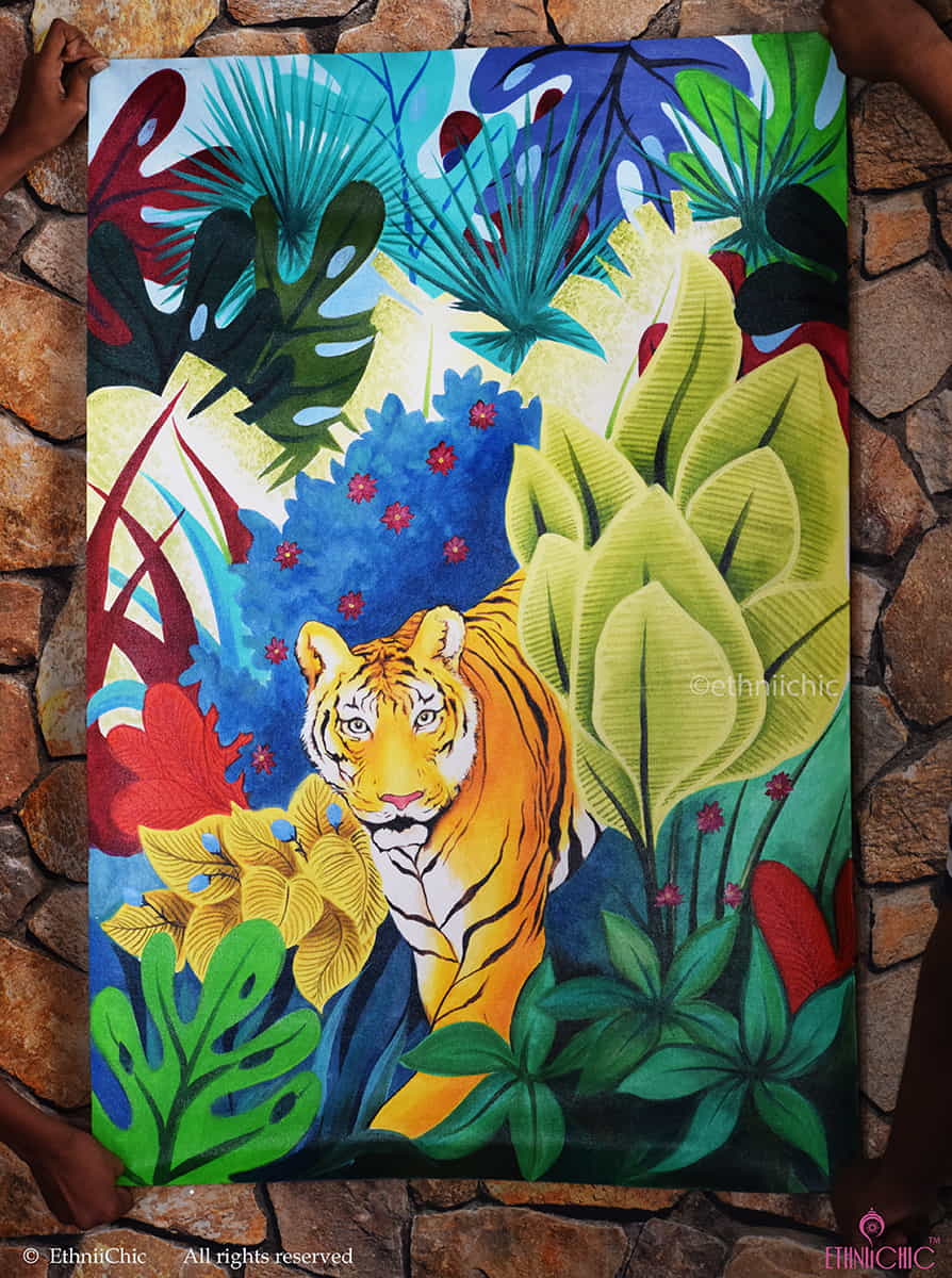 A commissioned Painting on canvas of size 2 feet x 3 feet of Tiger in the woods, was done for a customer in Bangalore.