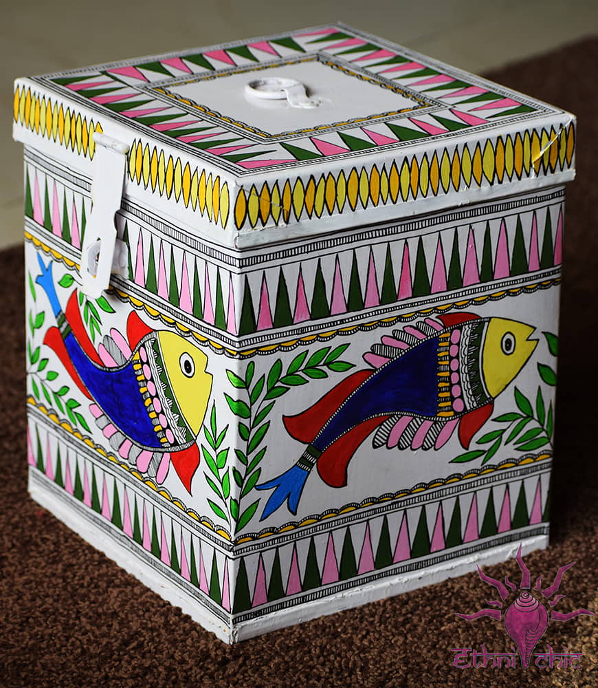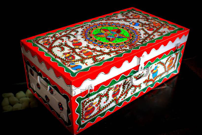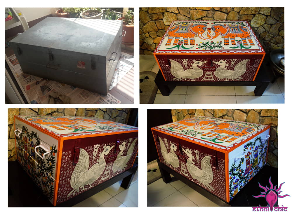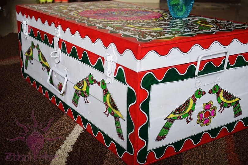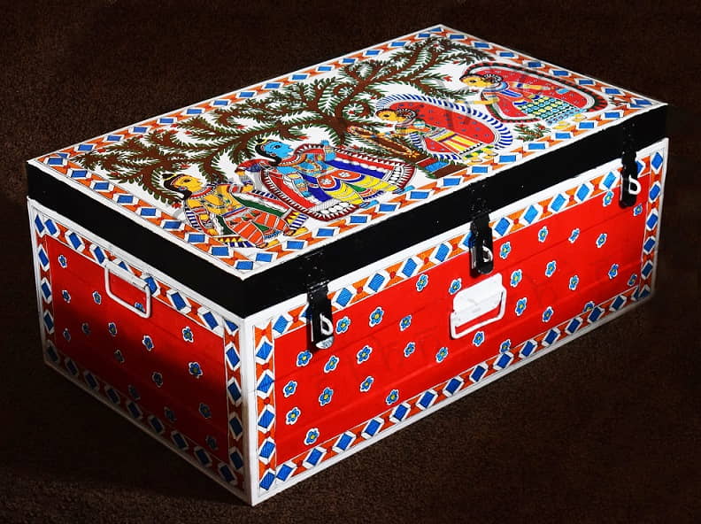 A commissioned work of painting a metal trunk of size 3 feet x 2 feet, in Madhubani style of painting, which was shipped to Australia.