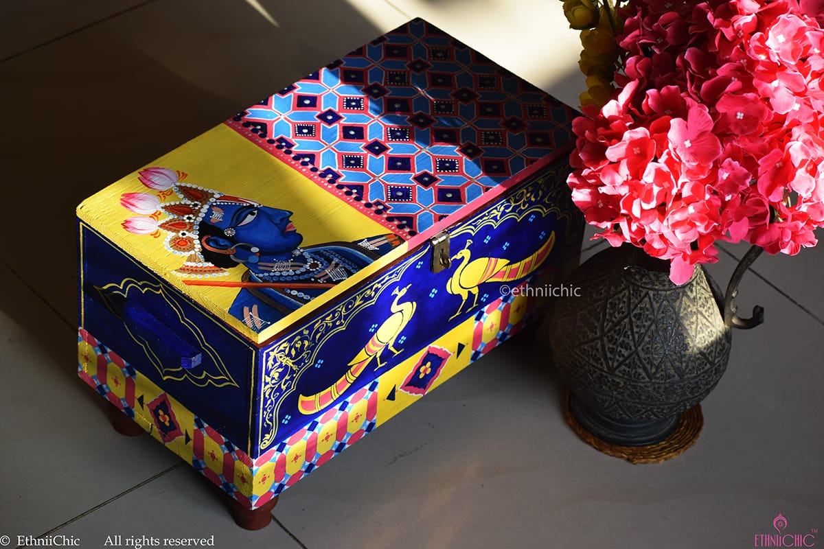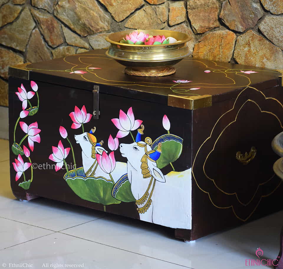 A commissioned project to upcycle the heirloom Kerala trunk with Pichwai Cow and Lotus Motifs was done