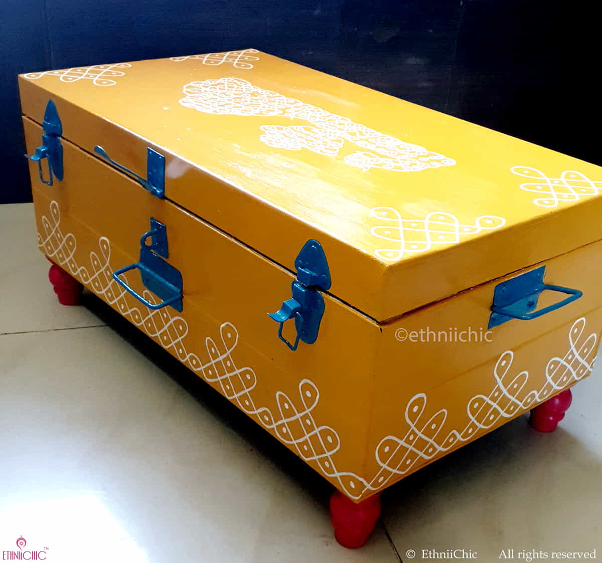A commissioned project to upcycle an old trunk with Kolam Motifs was done