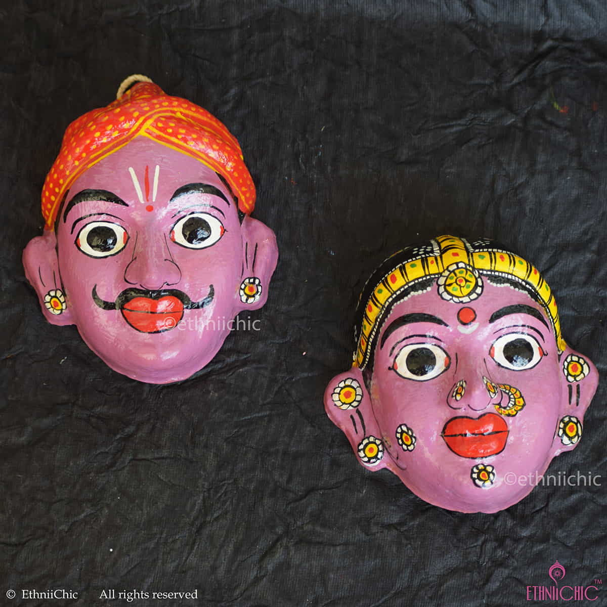 This pair of decorative wall masks are painstakingly handmade using the traditional techniques with natural items like tamarind seed powder and saw dust. Comes with a loop in the back for hanging on the wall.