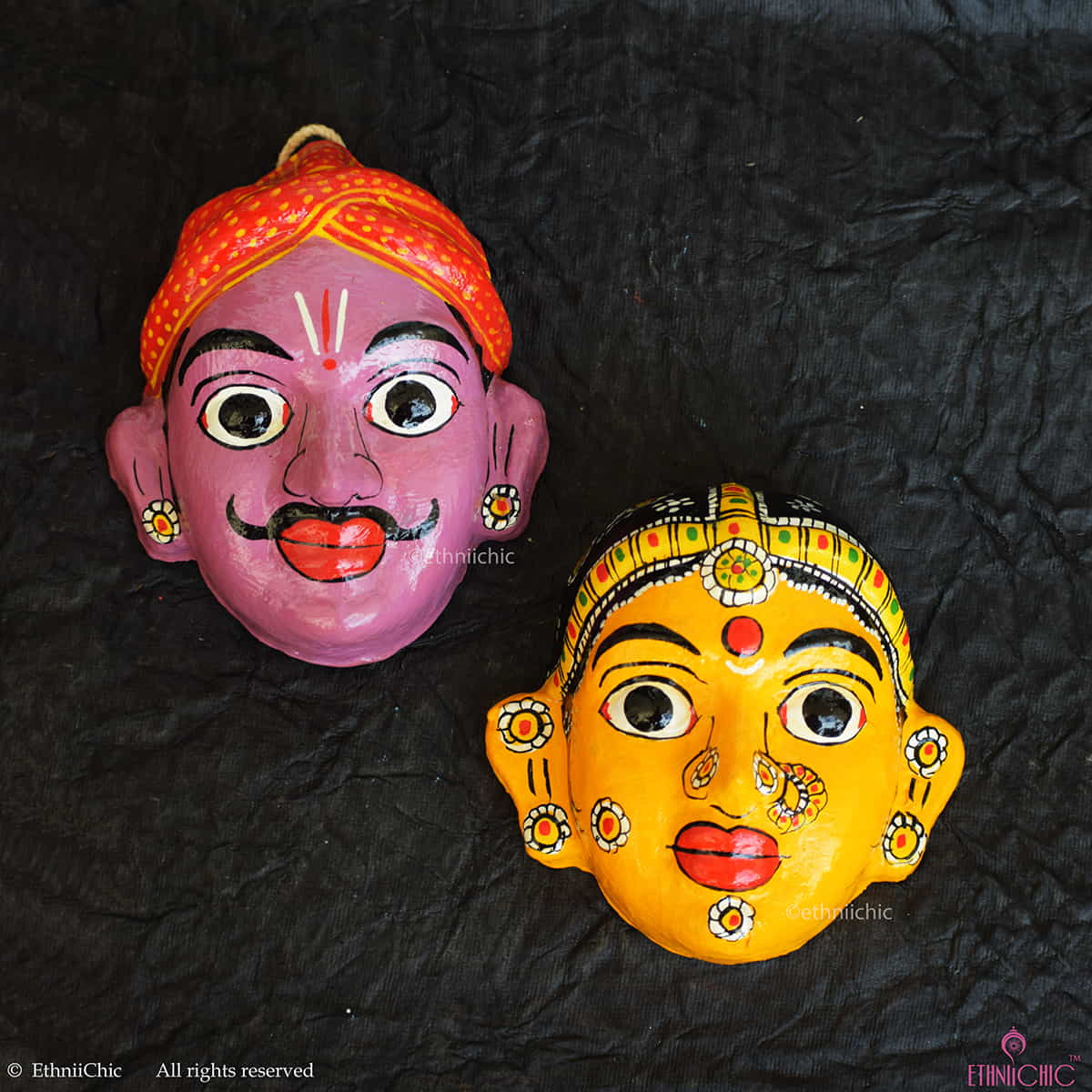 This pair of decorative wall masks are painstakingly handmade using the traditional techniques with natural items like tamarind seed powder and saw dust. Comes with a loop in the back for hanging on the wall.
