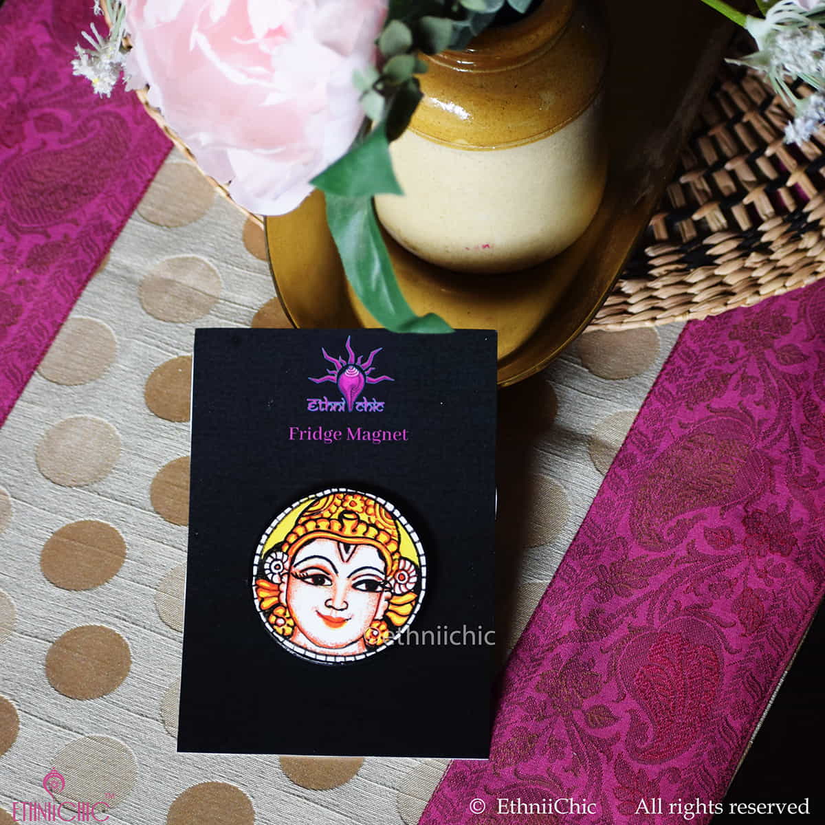 Bring the vibrance of tradition into your living space with this handcrafted fridge magnet featuring exquisite Kerala Mural Art motifs. Each piece is carefully crafted, capturing the grace, colors, and intricate details that define this centuries-old temple art form.