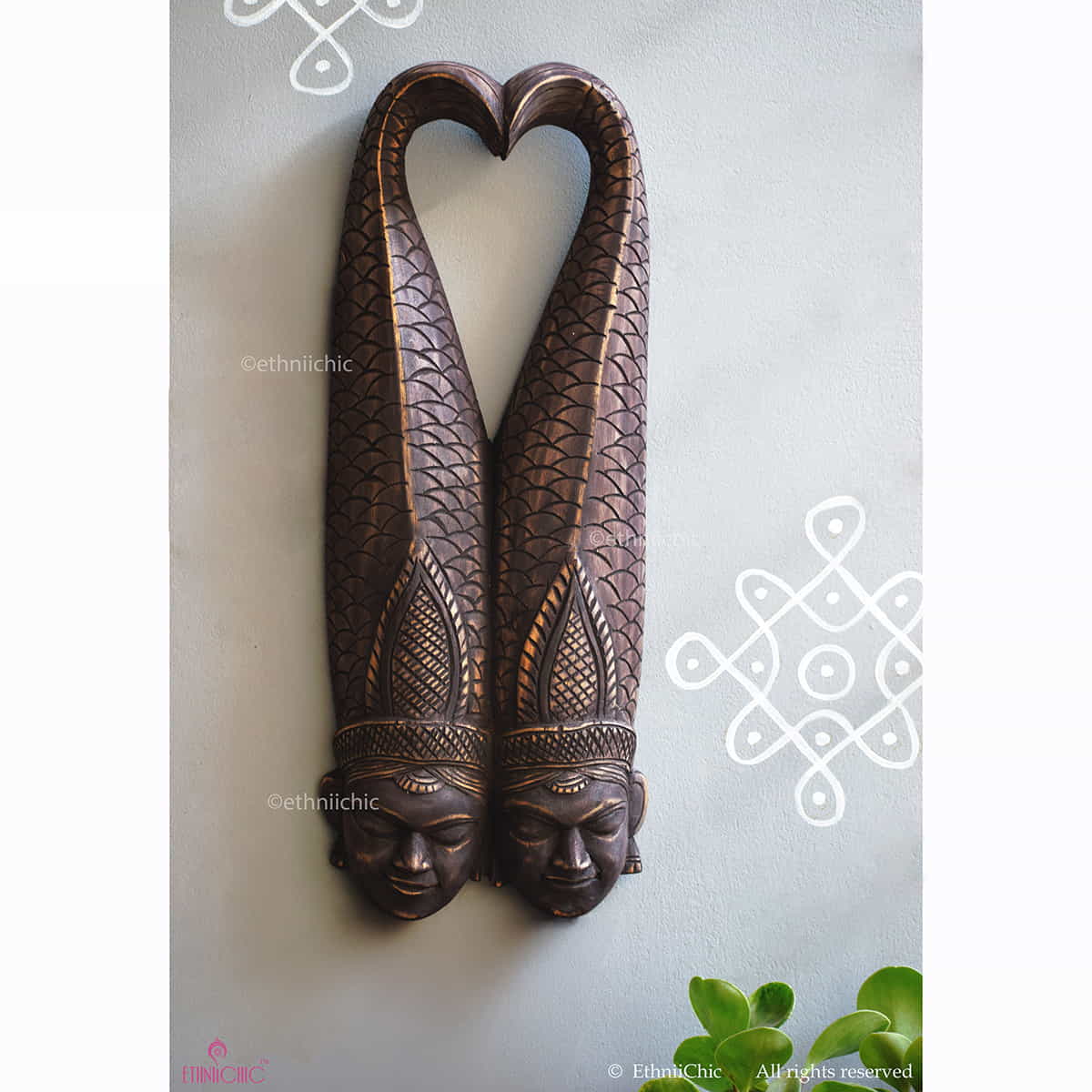 Wooden Hand carved Gambhira Wall Mask Twin Pair with Fish Crown